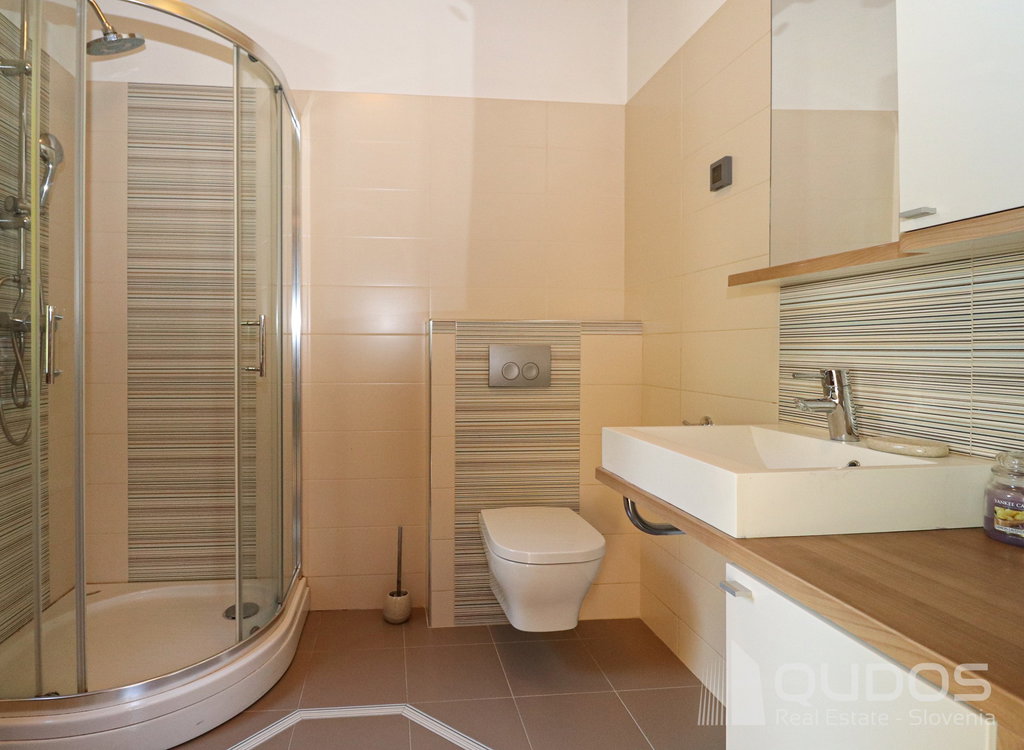 V nadstropju se nahaja velik skupni prostor, ki zajema kuhinjo jedilnico in dnevno sobo, prostorna terasa, utility/shramba, ki je takoj za kuhinjo, velika spalnica ali delovna soba in ločen wc.