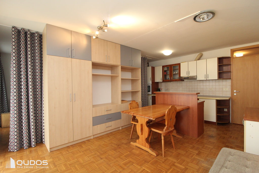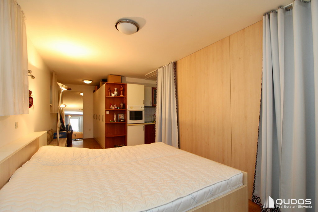 Stanovanje trenutno obsega predprostor, kopalnico ter en velik prostor, v katerem so kuhinja, dnevna soba ter spalni del, ki je ločen s pregradno omaro. Sam prostor pa se da pregraditi tudi s klasično steno, tako da dobimo popolnoma ločeno spalnico z izhodom na atrij. Neto tlorisna površina stanovanja je 55,4m2, atrij, ki pripada stanovanju pa meri 19m2.