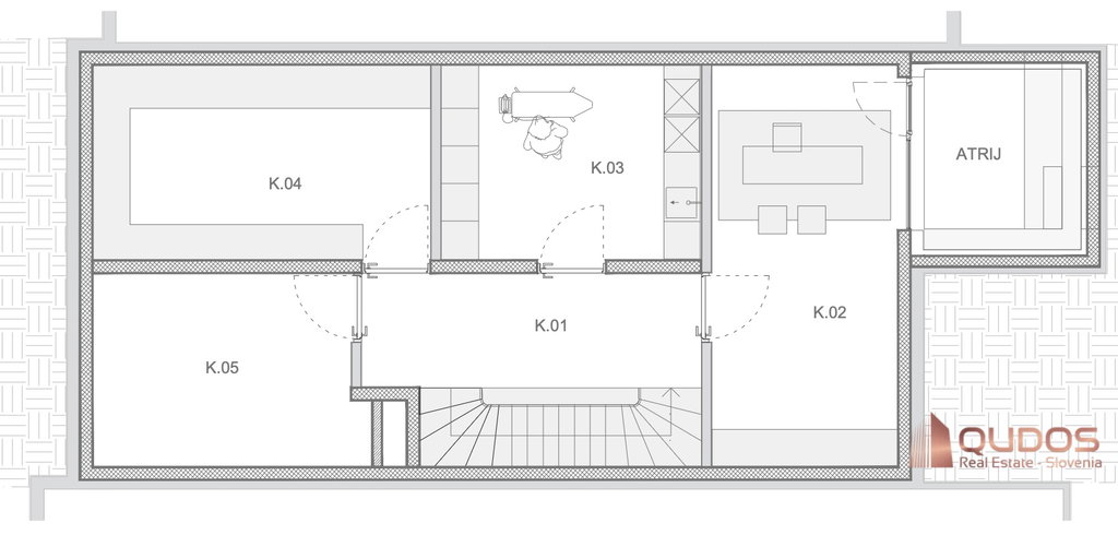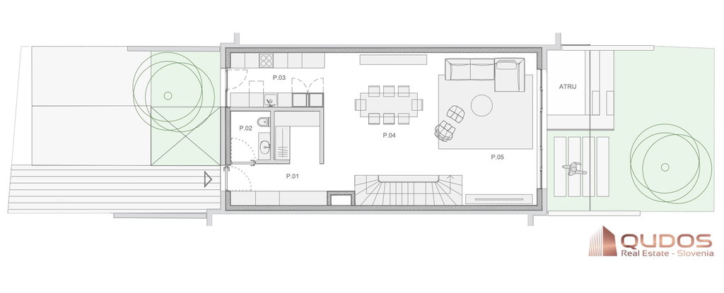 - PRITLIČJE: vhodni prostor, kuhinja, velik in svetel dnevni prostor z jedilnico, dnevni wc