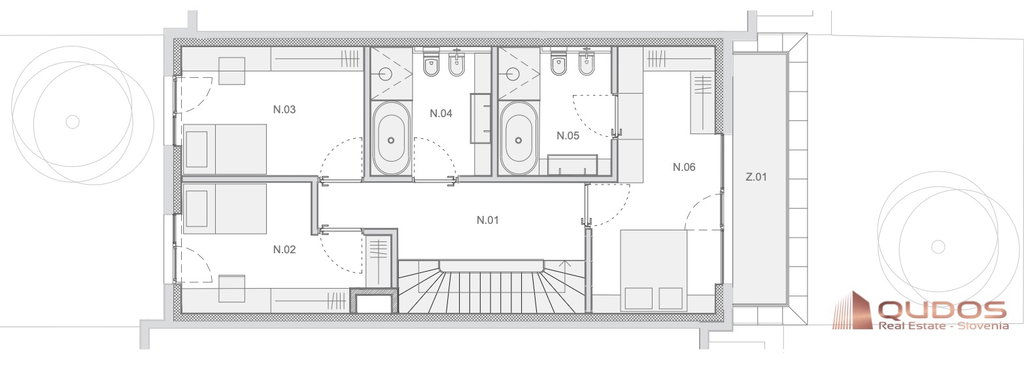 - NADSTROPJE: spalnica z garderobo ter lastno kopalnico, dve sobi, ter kopalnica.