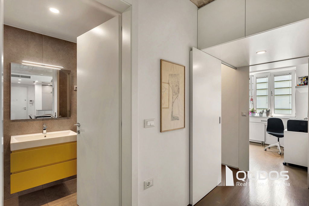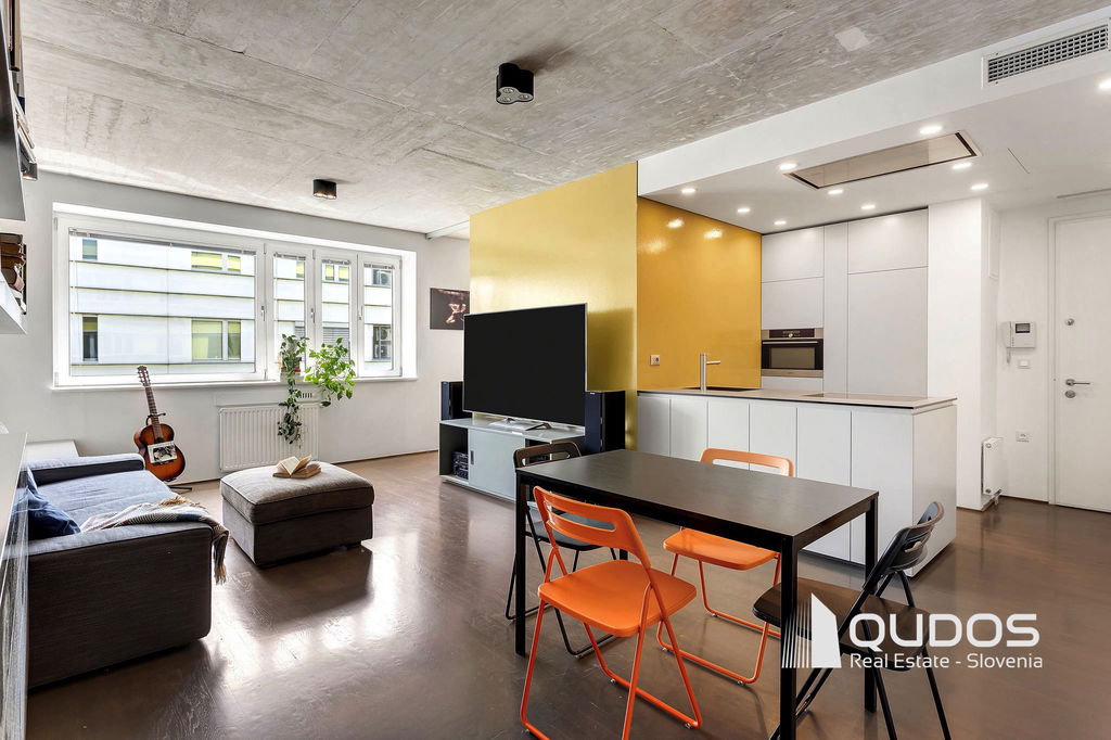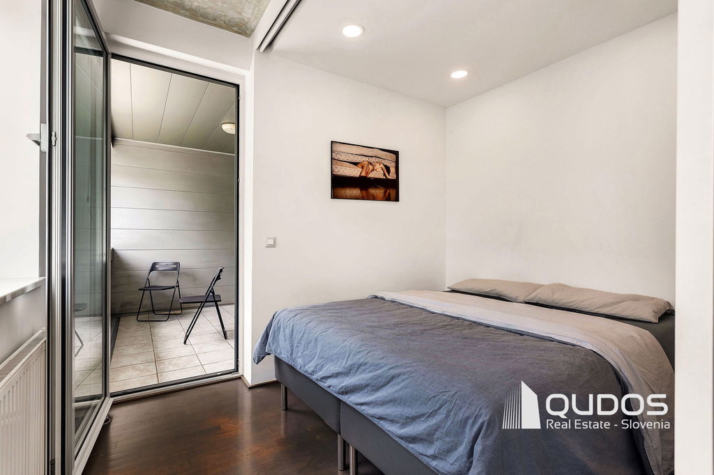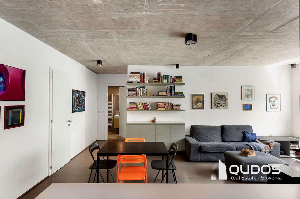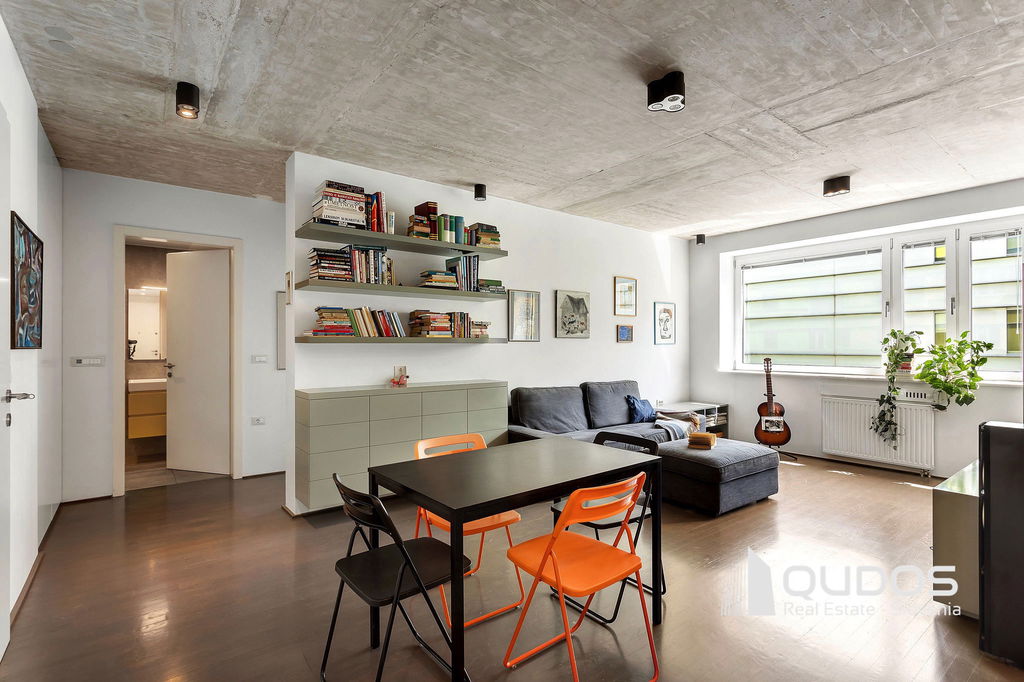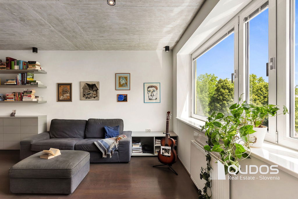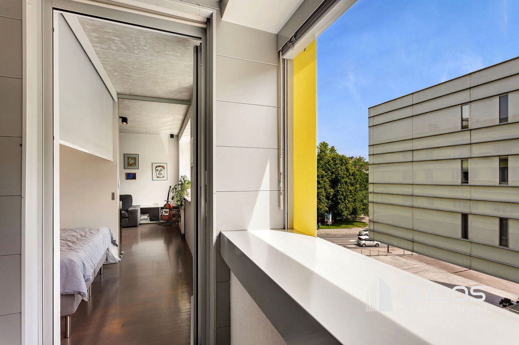 V ikonični zgradbi v bližini centra Ljubljane prodamo svetlo in moderno 2,5-sobno stanovanje. Stanovanje je lastnik po nakupu prenovil, odprl tloris in mu vdahnil izgled industrijskega lofta, kjer je oprema in okrasje minimalistično, na stropu pa je izpostavljen beton. Stanovanje sestoji iz večjega dnevnobivalnega prostora, dveh spalnic, kopalnice, garderobne sobe in utilityja ter večje lože. V minimalistični kuhinji je dovolj prostora za shranjevanje tudi za velike kuharje. Osrednji del stanovanja je svetel dnevni prostor, ki ga definira knjižna polica in skrbno izbrane slike. Iz tega prostora se dostopa tudi do prehodne niše, v kateri se nahaja spalnica. Spalnica se lahko skrije za rolo, ko dostopamo do balkona oz. spremenit v čisto pravo sobo, če zapremo drsna vrata do dnevnega prostora. Pred drugo spalnico se nahaja tudi garderobno prostor, kjer je dovolj prostora za shranjevanje vsega potrebnega. Kopalnica je opremljena z tušem, zraven pa se nahaja tudi utility s pralnim in sušilnim strojem. Balkonska loža je dovolj velika za postavitev mize s stoli, tu boste lahko gostili prijatelje v poletnih mesecih.