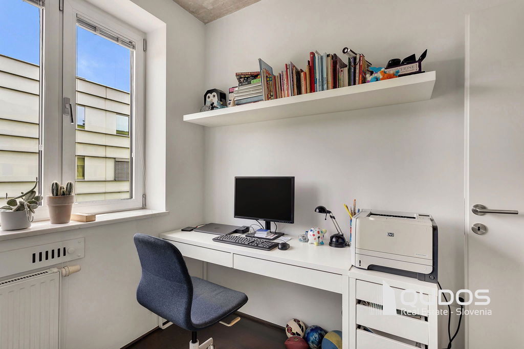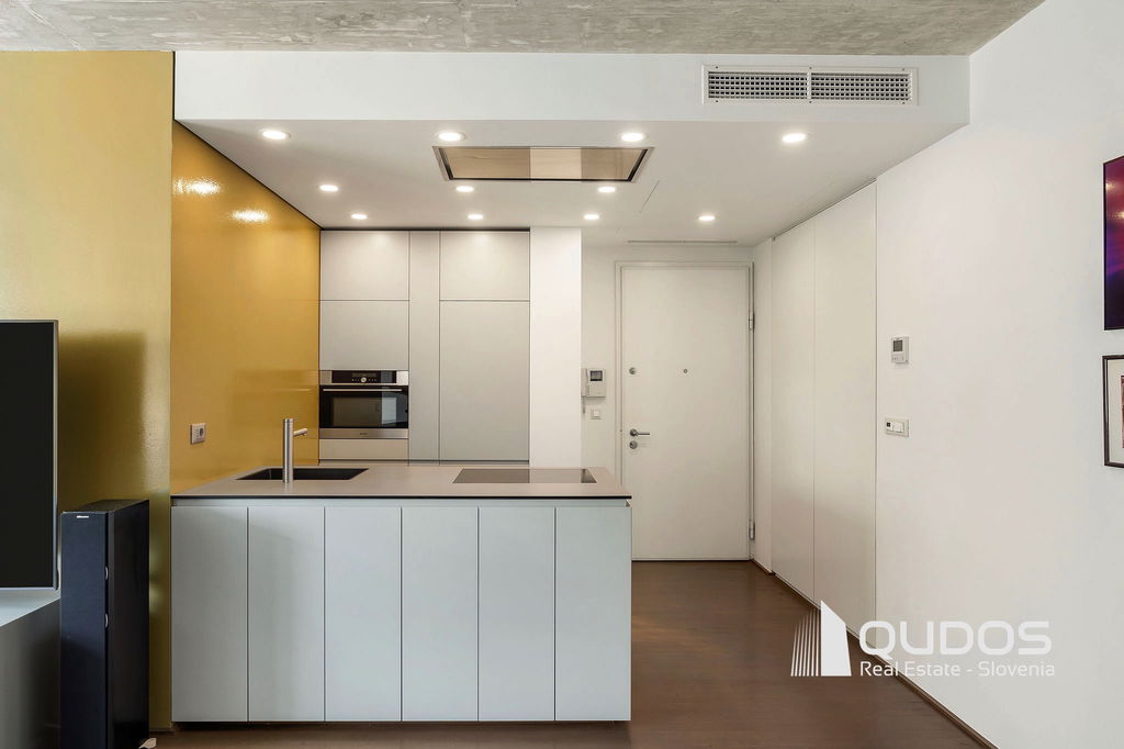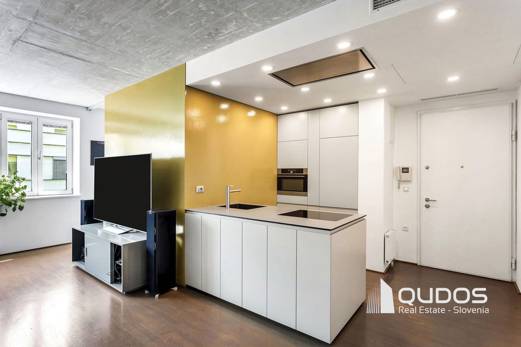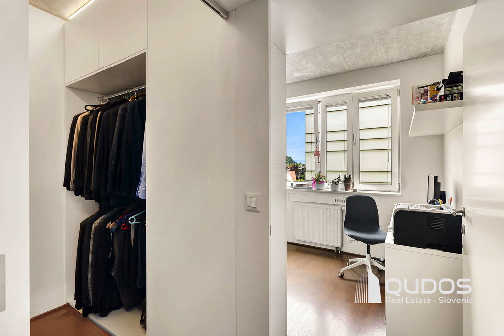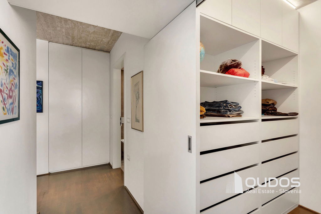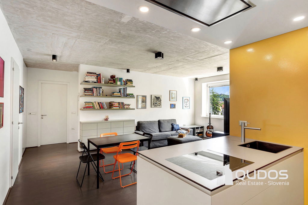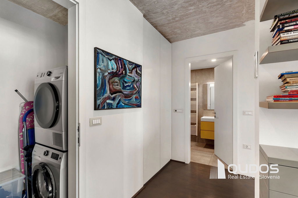 V ikonični zgradbi v bližini centra Ljubljane prodamo svetlo in moderno 2,5-sobno stanovanje. Stanovanje je lastnik po nakupu prenovil, odprl tloris in mu vdahnil izgled industrijskega lofta, kjer je oprema in okrasje minimalistično, na stropu pa je izpostavljen beton. Stanovanje sestoji iz večjega dnevnobivalnega prostora, dveh spalnic, kopalnice, garderobne sobe in utilityja ter večje lože. V minimalistični kuhinji je dovolj prostora za shranjevanje tudi za velike kuharje. Osrednji del stanovanja je svetel dnevni prostor, ki ga definira knjižna polica in skrbno izbrane slike. Iz tega prostora se dostopa tudi do prehodne niše, v kateri se nahaja spalnica. Spalnica se lahko skrije za rolo, ko dostopamo do balkona oz. spremenit v čisto pravo sobo, če zapremo drsna vrata do dnevnega prostora. Pred drugo spalnico se nahaja tudi garderobno prostor, kjer je dovolj prostora za shranjevanje vsega potrebnega. Kopalnica je opremljena z tušem, zraven pa se nahaja tudi utility s pralnim in sušilnim strojem. Balkonska loža je dovolj velika za postavitev mize s stoli, tu boste lahko gostili prijatelje v poletnih mesecih.