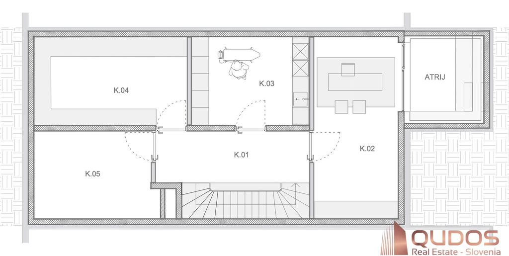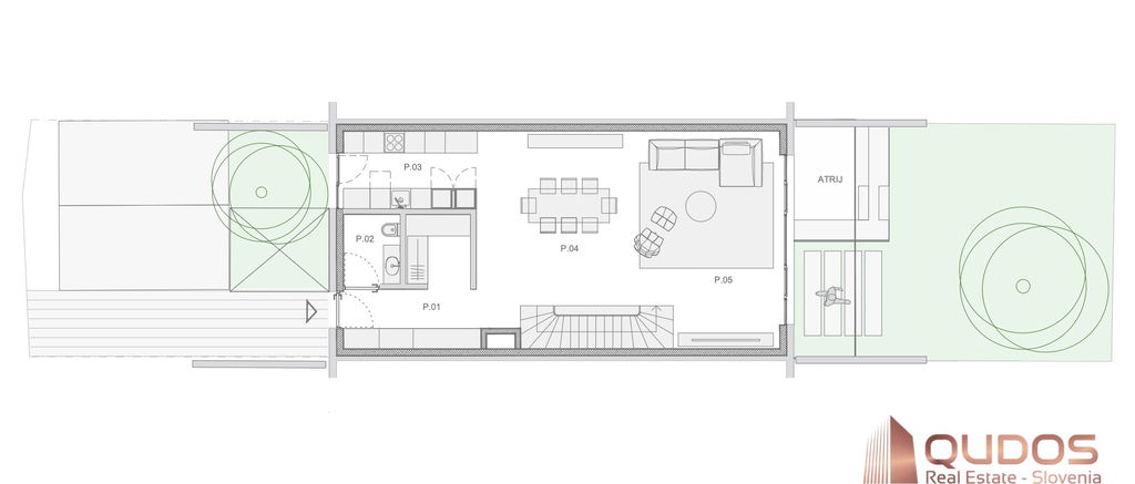 - PRITLIČJE: vhodni prostor, kuhinja, velik in svetel dnevni prostor z jedilnico, dnevni wc