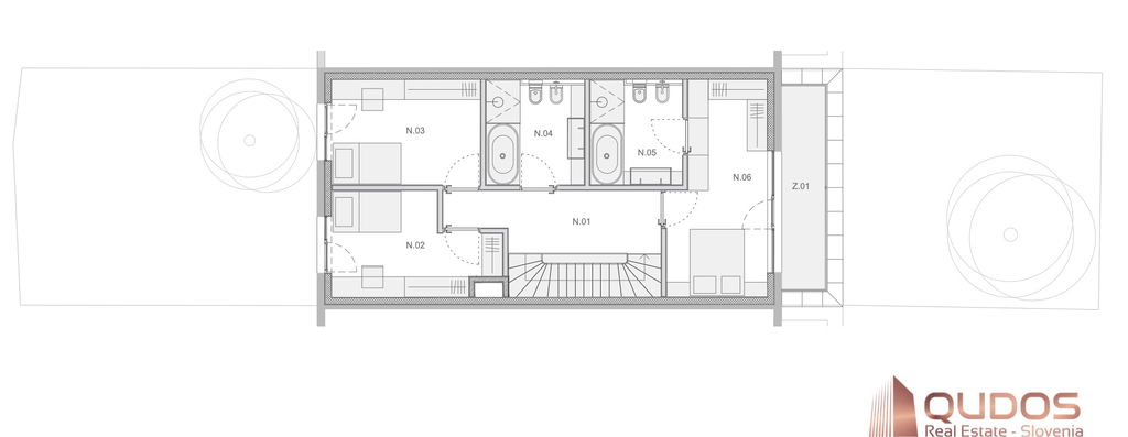 - NADSTROPJE: spalnica z garderobo ter lastno kopalnico, dve sobi, ter kopalnica.