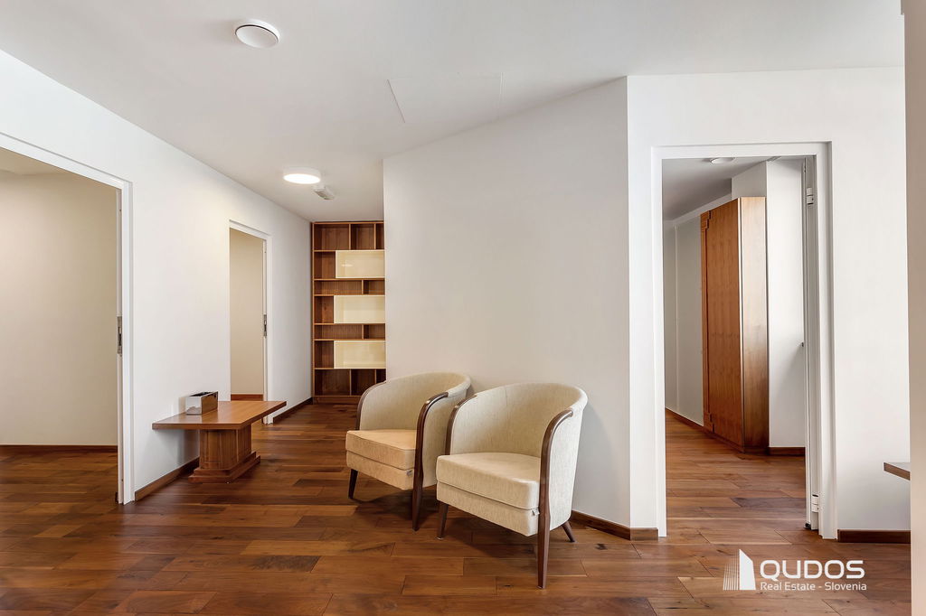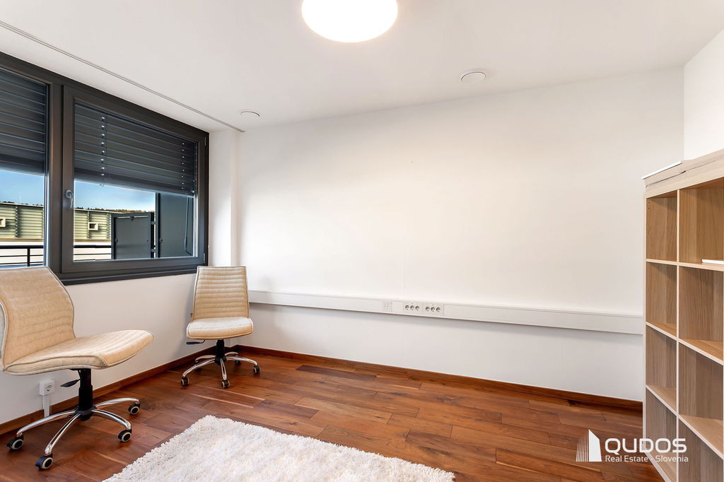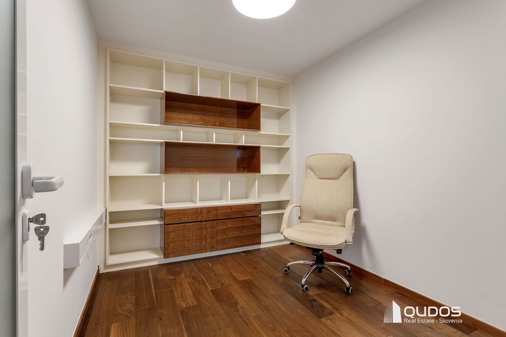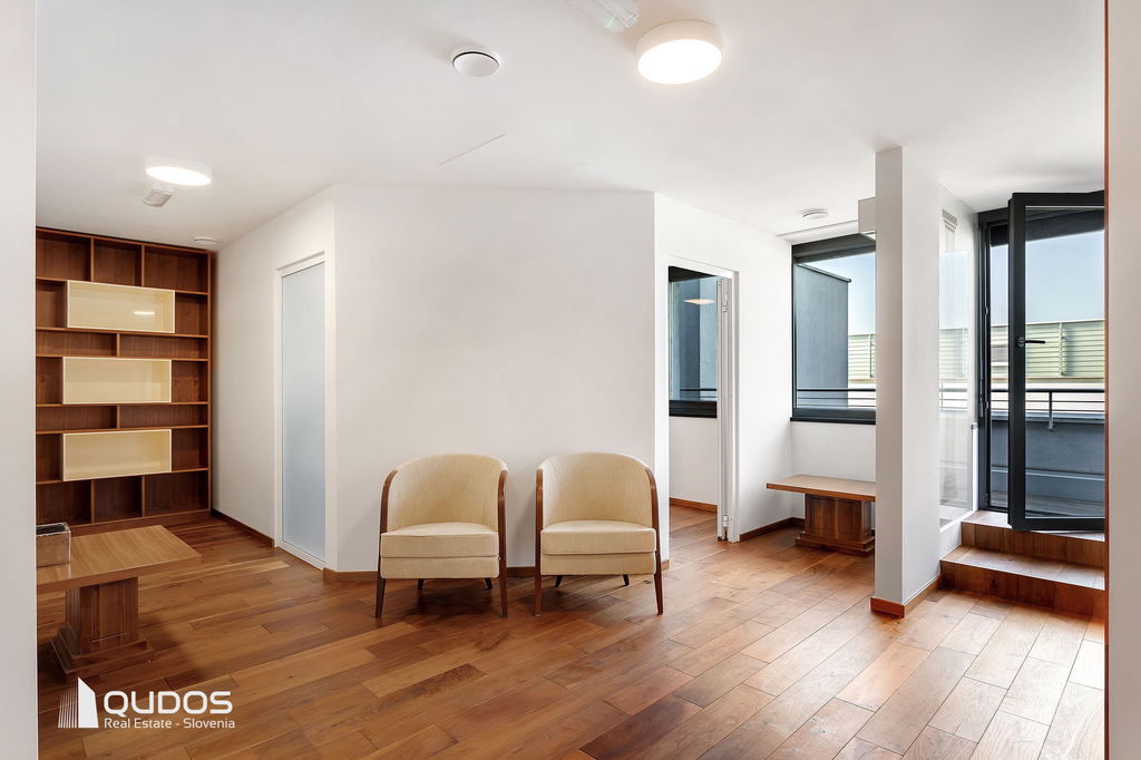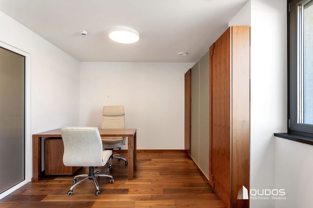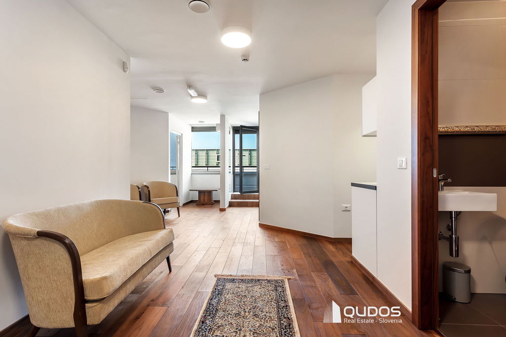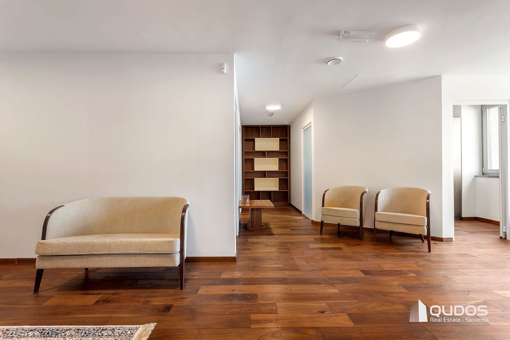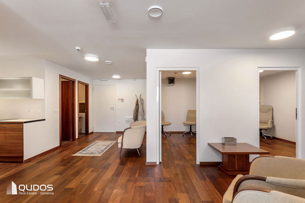 Poslovni prostor sestavljajo večji osrednji (sprejemni) prostor, štiri ločene pisarne, dve toaleti ter opremljena manjša kuhinja. Iz osrednjega prostora, ki povezuje vse prostore, je dostop do velike zasebne terase (19,84 m2), s katere se odpira lep pogled proti Golovcu.