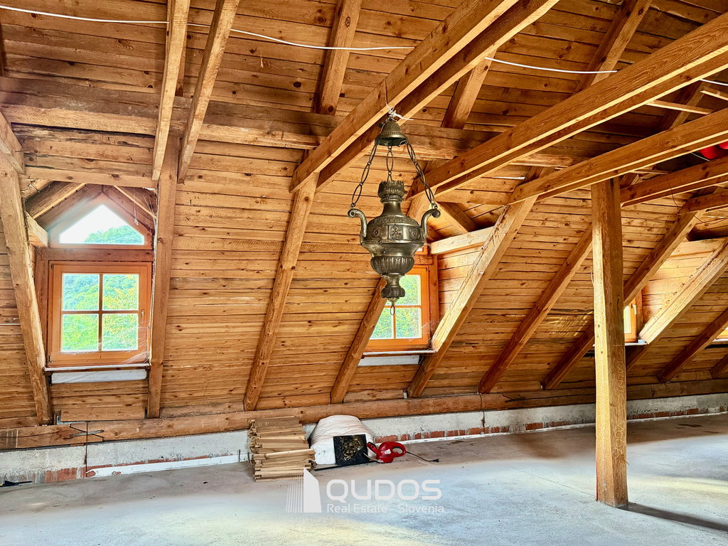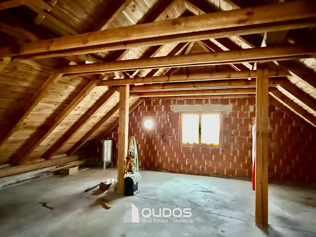Hiša pa skriva še en velik potencial – nad pritličjem se nahaja visoko, neizdelano podstrešje s številnimi strešnimi okni in frčadami, ki zagotavljajo odlično naravno osvetlitev, dnevni prostori obeh potencialnih prihodnjih stanovanj pa imajo klasična zidna okna (v večjem tudi balkon), ne le strešnih.