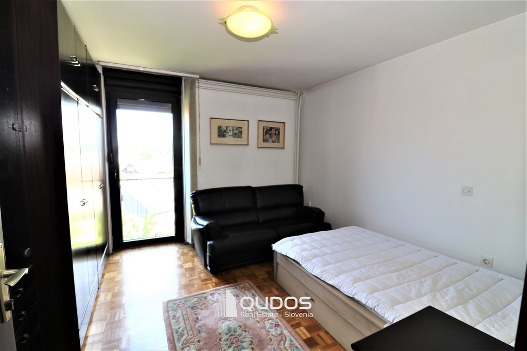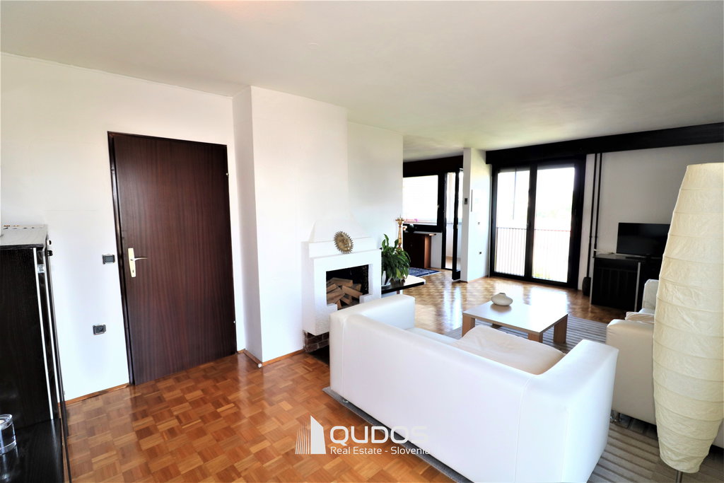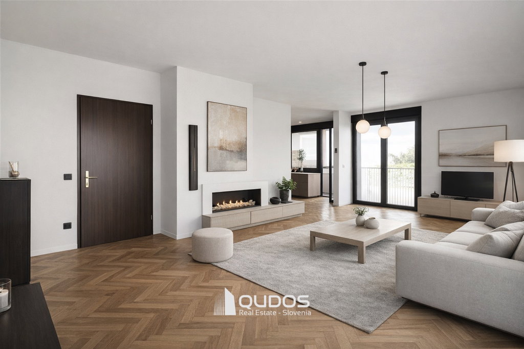 Razporeditev vključuje prostoren dnevni prostor s kaminom, kuhinjo z jedilnico in izhodom na balkon, dve spalnici (ena z balkonom) ter ločeno kopalnico in WC. Shramba je izven stanovanja v isti etaži (namesto v kleti), stanovanju pa pripadata tudi dve podzemni garažni mesti, kar je prava redkost v tem delu mesta in predstavljata pomembno dodano vrednost.