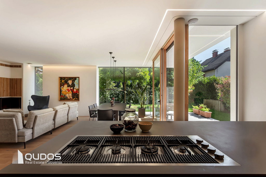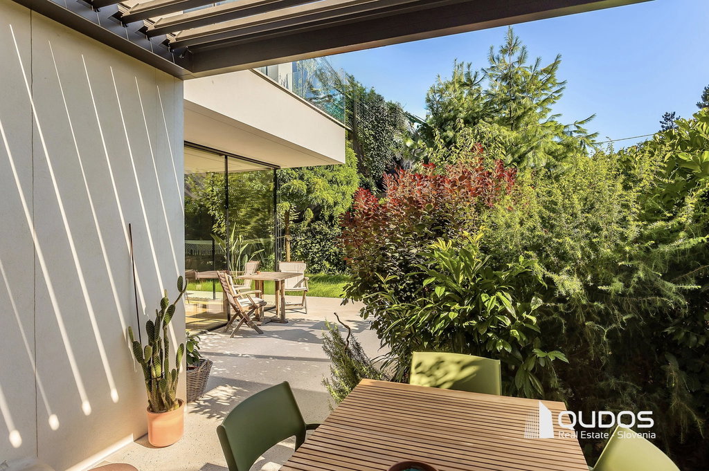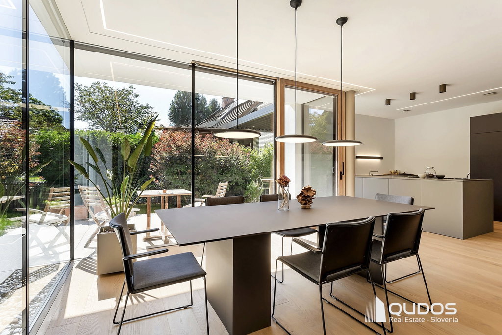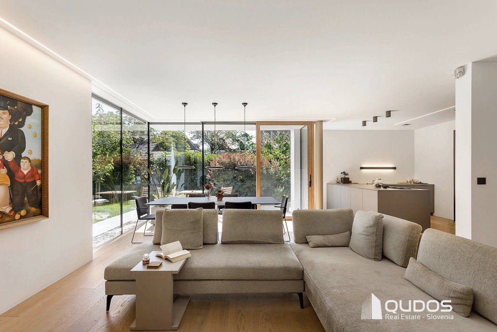 Predstavljam sodobno hišo v Trnovem, ki je bila zgrajena pred petimi leti in je od središča Ljubljane oddaljena le 600 m. Hiša navduši z odprtostjo, eleganco in občutkom življenja sredi narave. Vse etaže preplavlja naravna svetloba, panoramske steklene stene brišejo meje med notranjim in zunanjim prostorom ter poudarjajo prostornost in hiši dajejo občutek svobode. Zasebne terase, skrbno zasajen vrt, čudoviti sončni zahodi in popoln mir ustvarjajo občutek urbanega zatočišča v središču mesta.