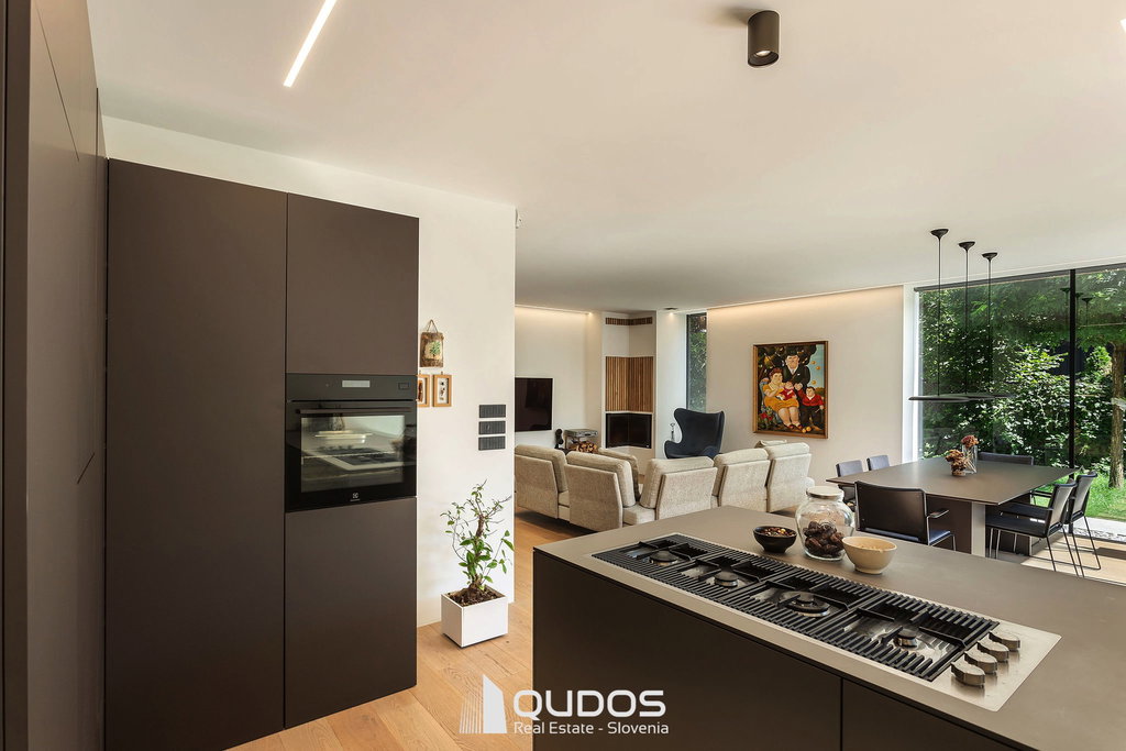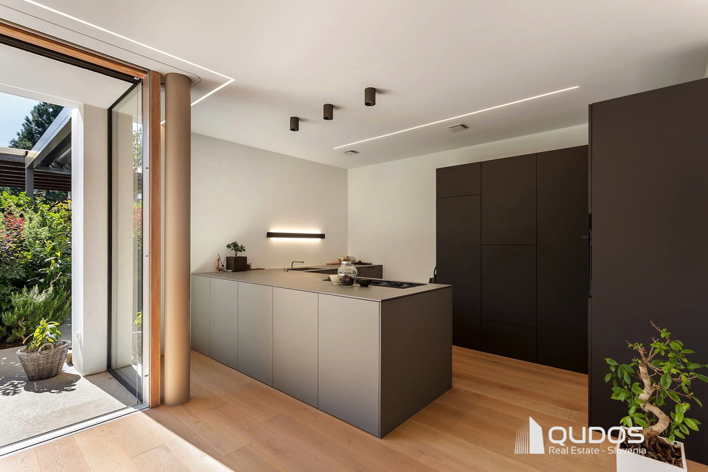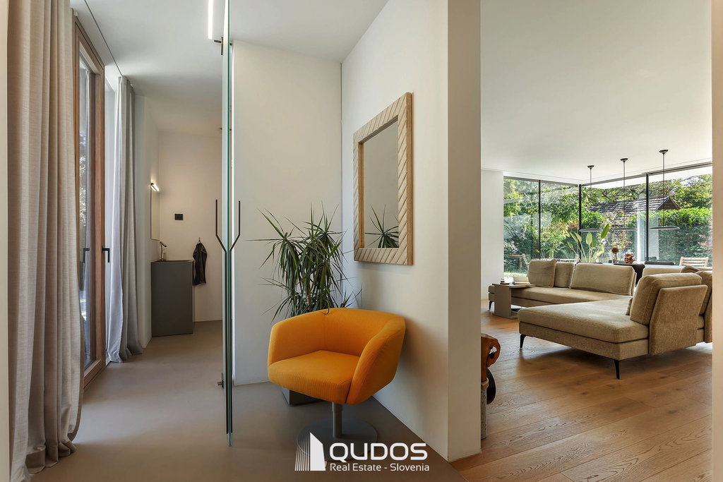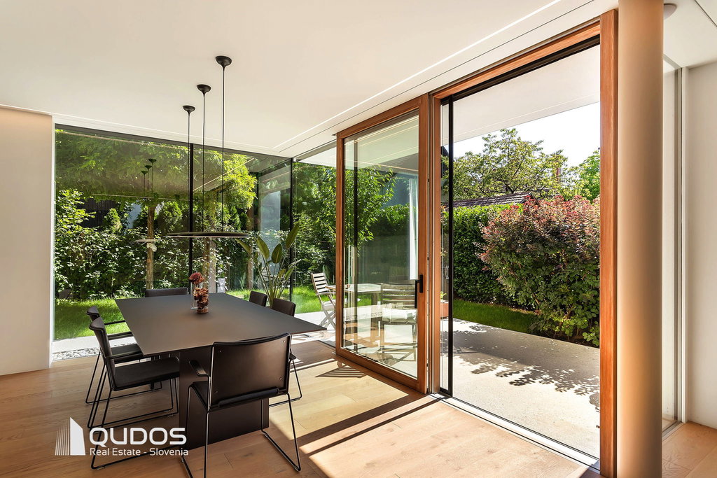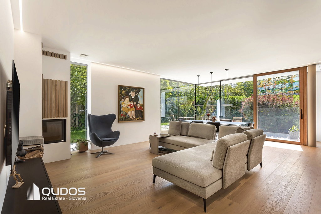 Predstavljam sodobno hišo v Trnovem, ki je bila zgrajena pred petimi leti in je od središča Ljubljane oddaljena le 600 m. Hiša navduši z odprtostjo, eleganco in občutkom življenja sredi narave. Vse etaže preplavlja naravna svetloba, panoramske steklene stene brišejo meje med notranjim in zunanjim prostorom ter poudarjajo prostornost in hiši dajejo občutek svobode. Zasebne terase, skrbno zasajen vrt, čudoviti sončni zahodi in popoln mir ustvarjajo občutek urbanega zatočišča v središču mesta.