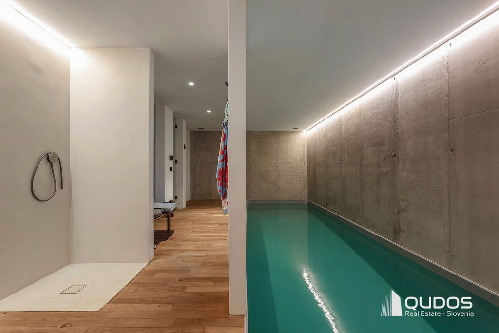V kleti pa je skrit prostor za popolno regeneracijo v udobju doma, vaš lastni wellness: notranji bazen dolžine 9 m ter prostor za savno, poleg tega pa v kletni etaži najdemo še veliko garderobno sobo in tehnične prostore.