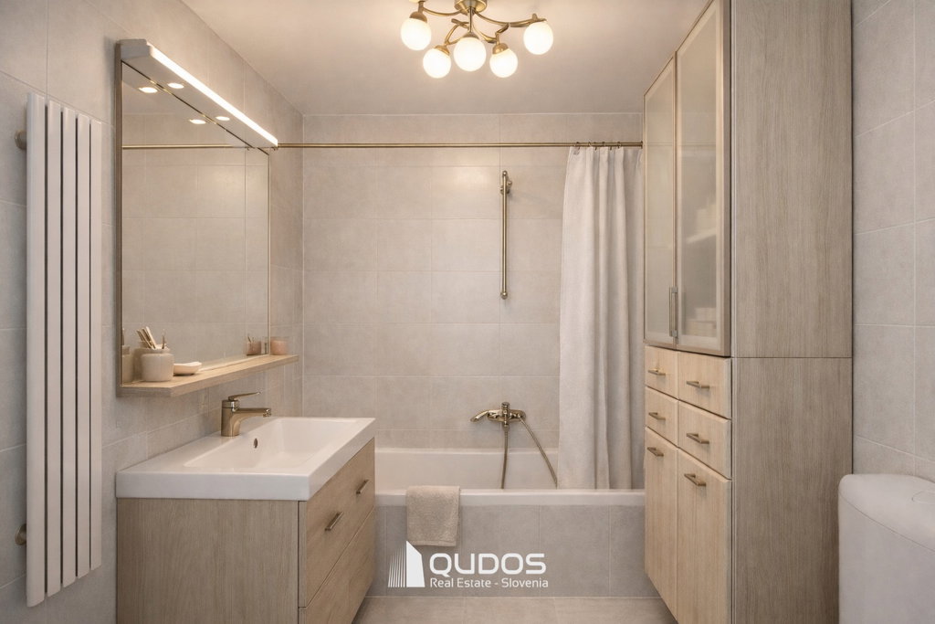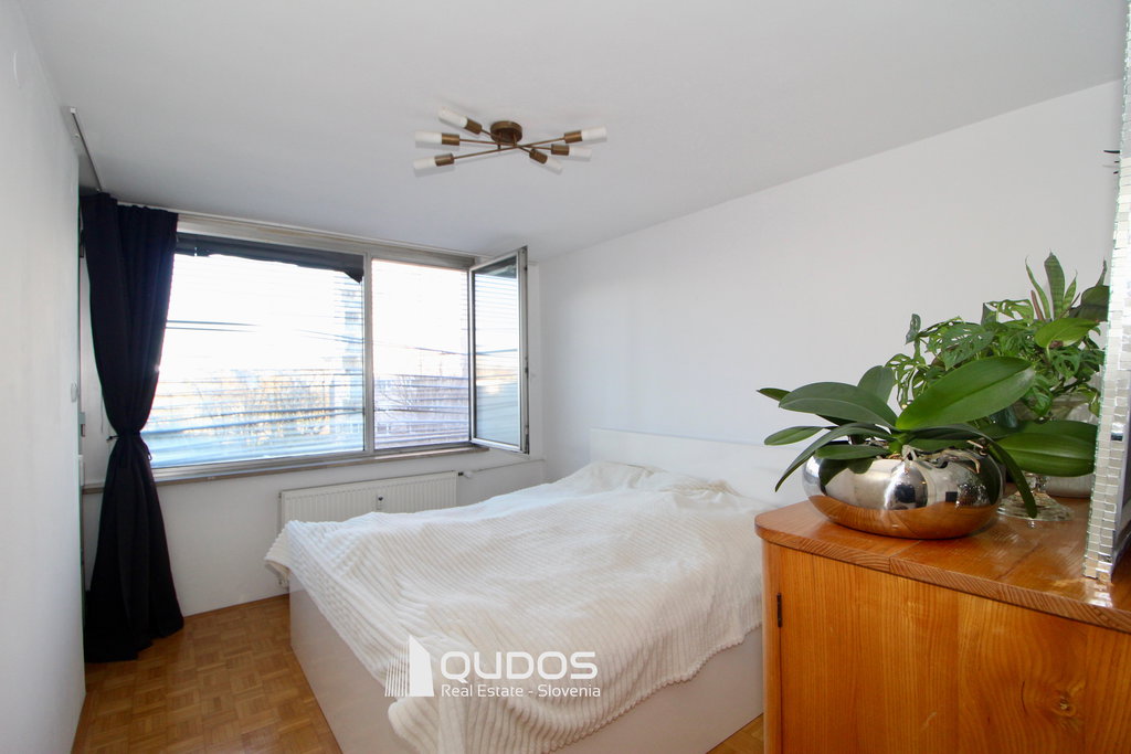 Stanovanje odlikuje res izjemna razporeditev: ravno prav velika predsoba, prostorna in svetla dnevna soba s kuhinjsko nišo in izhodom na zastekljen balkon, kopalnica ter spalnica, ki ima prav tako izhod na balkon. Med spalnico in kopalnico se skriva še zelo uporabna garderobna soba (pb. 4 m2), ki se jo lahko po potrebi preuredi npr. v kabinet.