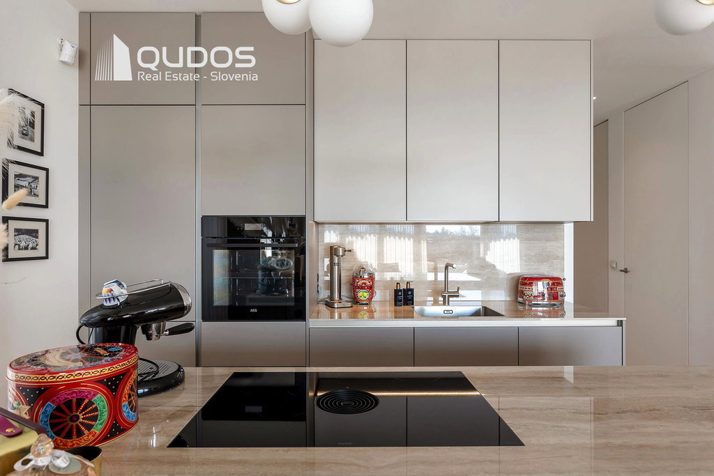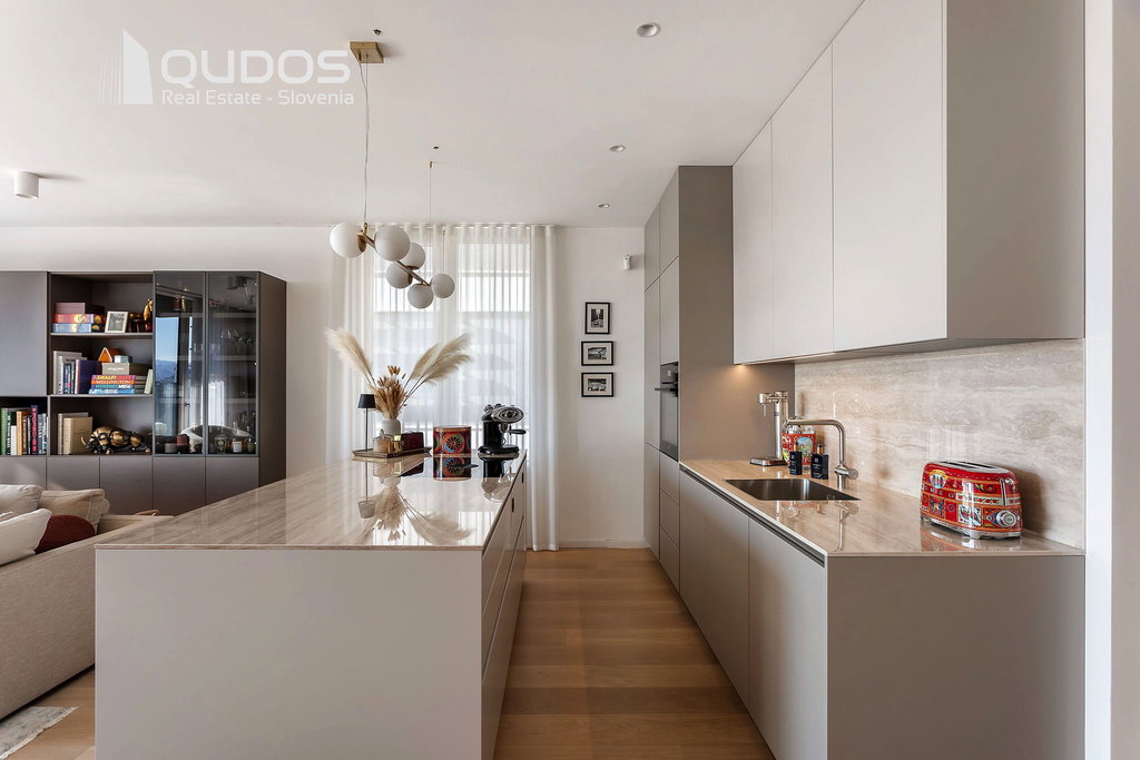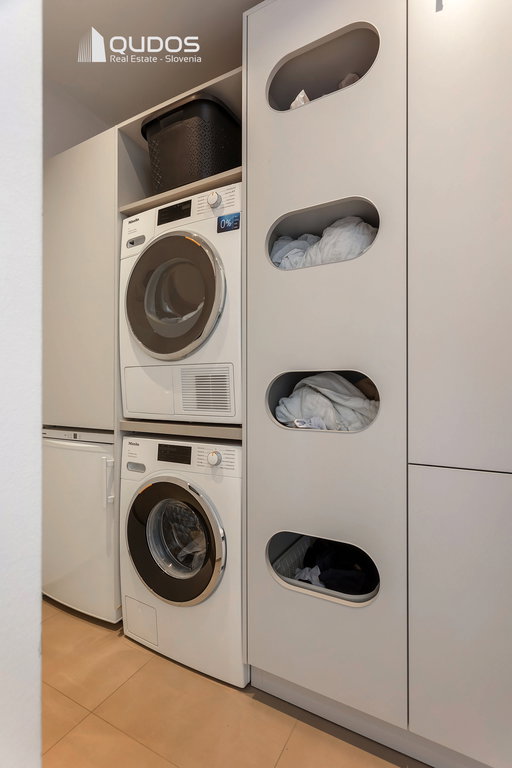 Oprema je izbrana premišljeno in brezčasno. Prevladujejo naravni materiali, mehke teksture in umirjena barvna paleta, ki prostoru daje toplino brez odvečnih poudarkov. Kuhinja proizvajalca Schüller je opremljena z vrhunskimi aparati: kuhališčem Bora z vgrajeno napo, kombinirano parno pečico, hladilnikom ter vinsko vitrino Liebherr. Tudi utility je izdelan v programu Schüller. Vgradno pohištvo je v celoti lakirano v mat izvedbi, kar prostoru dodaja eleganco in enotnost.