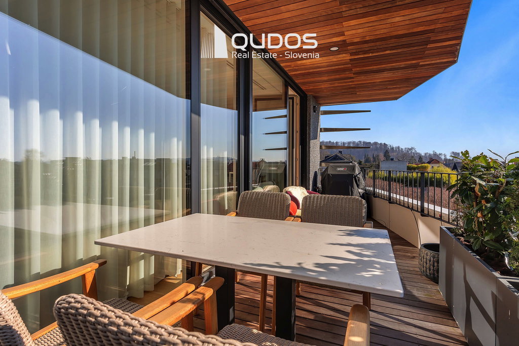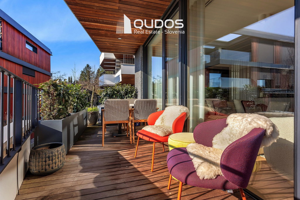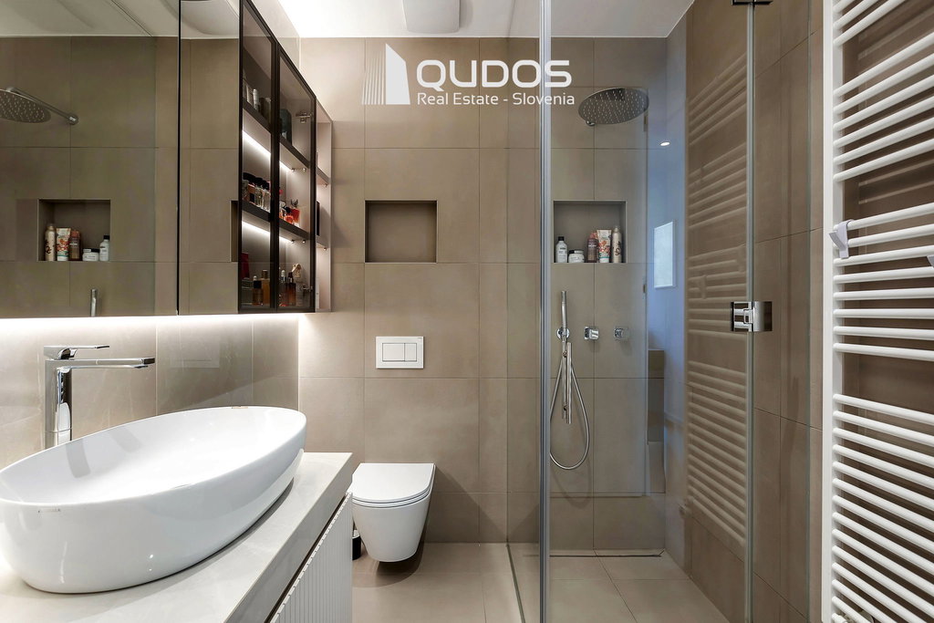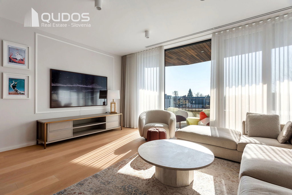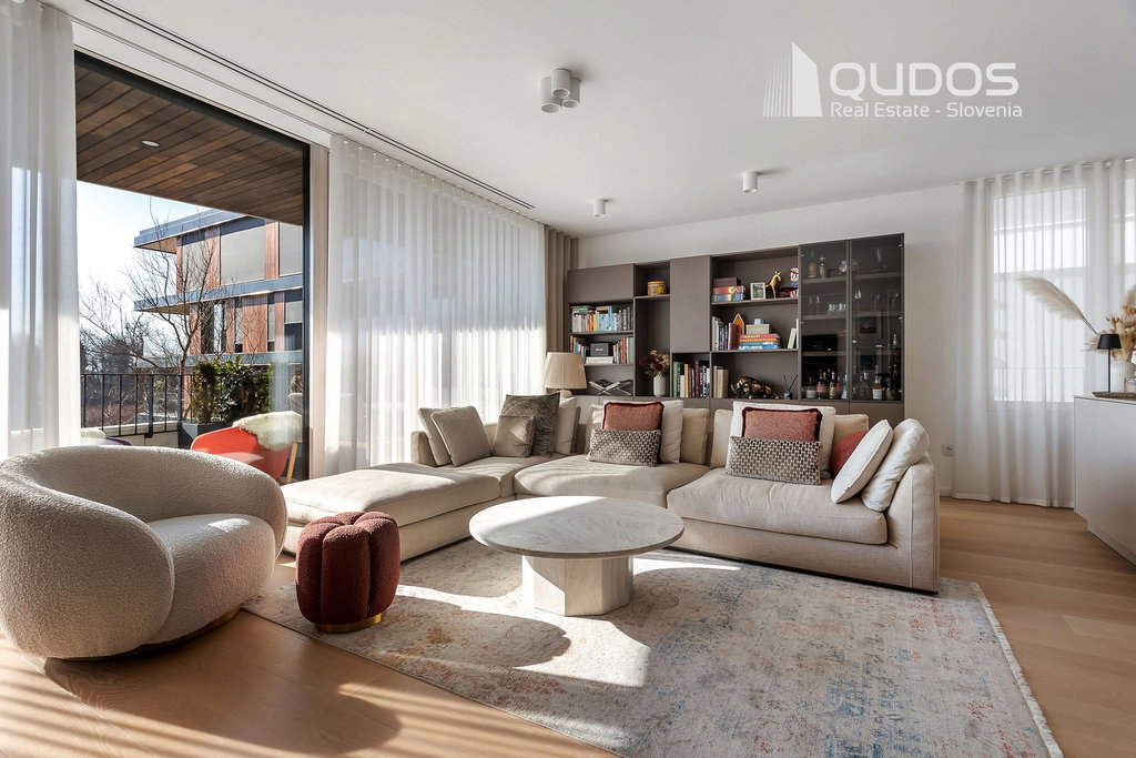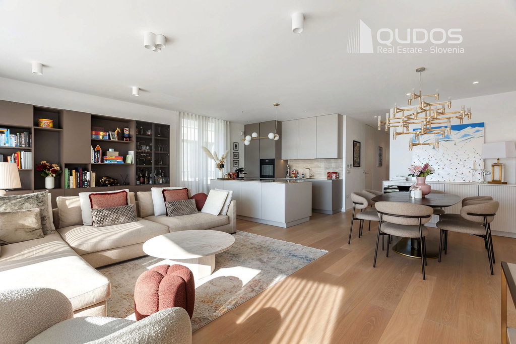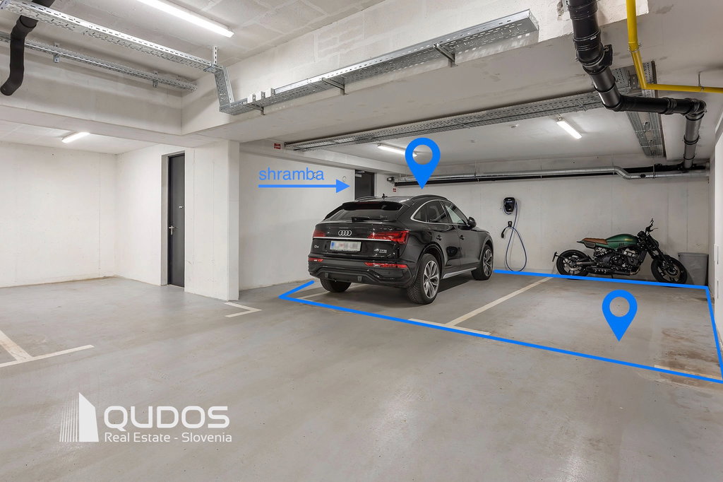 Stanovanje meri skupaj s teraso 124 m² (111 m² ogrevane površine in 13 m² terase). V kleti se nahajata shramba v izmeri 8 m² ter garažni boks velikosti 35 m². Parkirni mesti sta nadpovprečno veliki (skupna širina približno 6 metrov), z neposrednim dostopom do shrambe. Garaža je opremljena z lastno polnilnico za električna vozila. Objekt ima dvigalo.