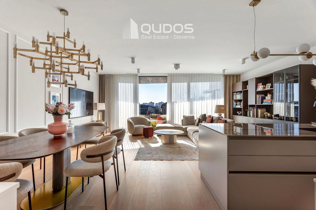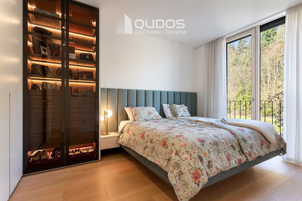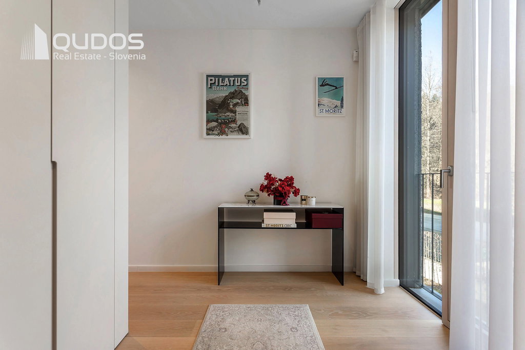Stanovanje, ki ga predstavljam, ni serijski produkt. Je dom, zasnovan z jasno idejo prostora in z občutkom za estetiko, svetlobo ter materiale. Tloris pravilne pravokotne oblike ustvarja občutek reda, ravnotežja in pretočnosti. Vstop je na severni strani, od koder se tloris logično razvije proti dnevnemu delu. Na levi so umeščeni servisni prostori, na desni 3 spalnice. Posebnost, ki jo redko srečamo – pogled iz dnevnega prostora in celo s terase na južni strani potuje skozi celotno stanovanje vse do zelenja Rožnika…